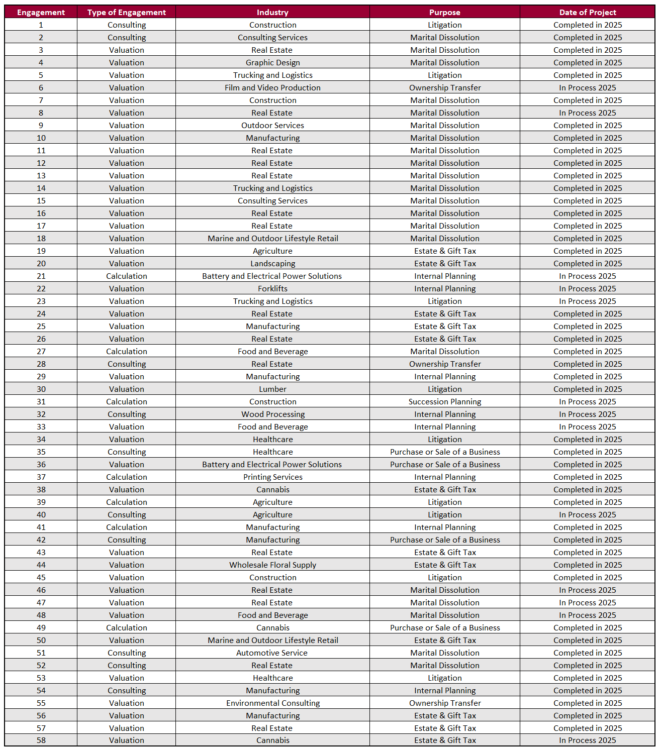 The team members here at Cogence Group were engaged in 58 Business Valuation matters during 2025.