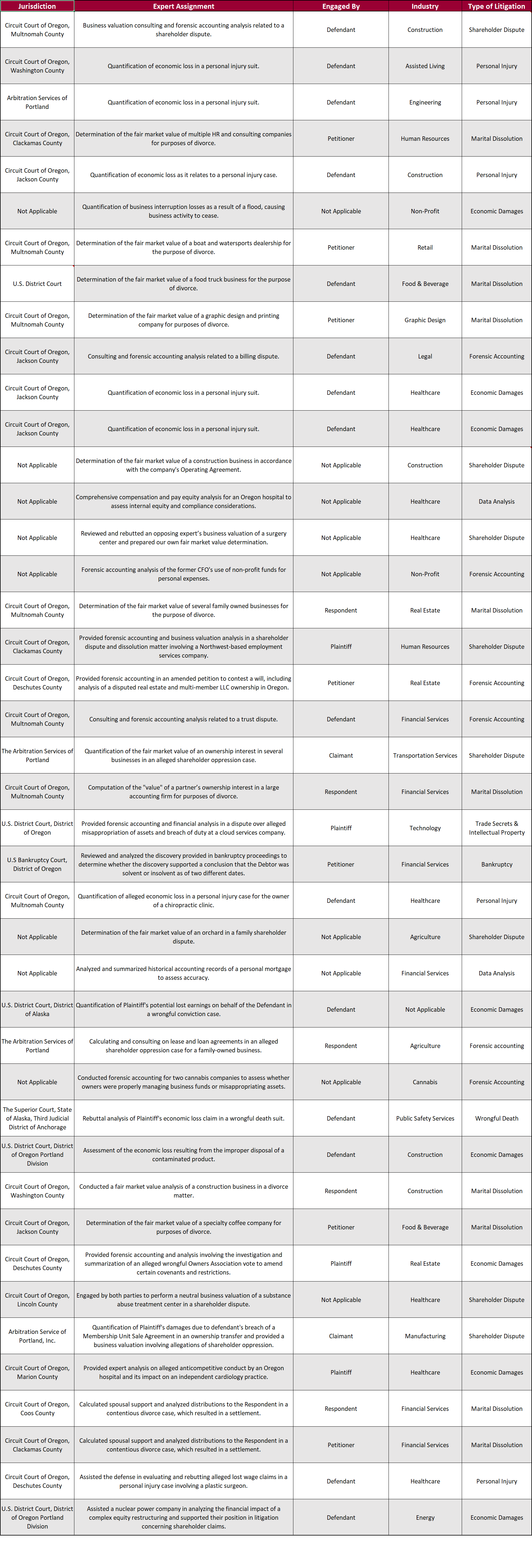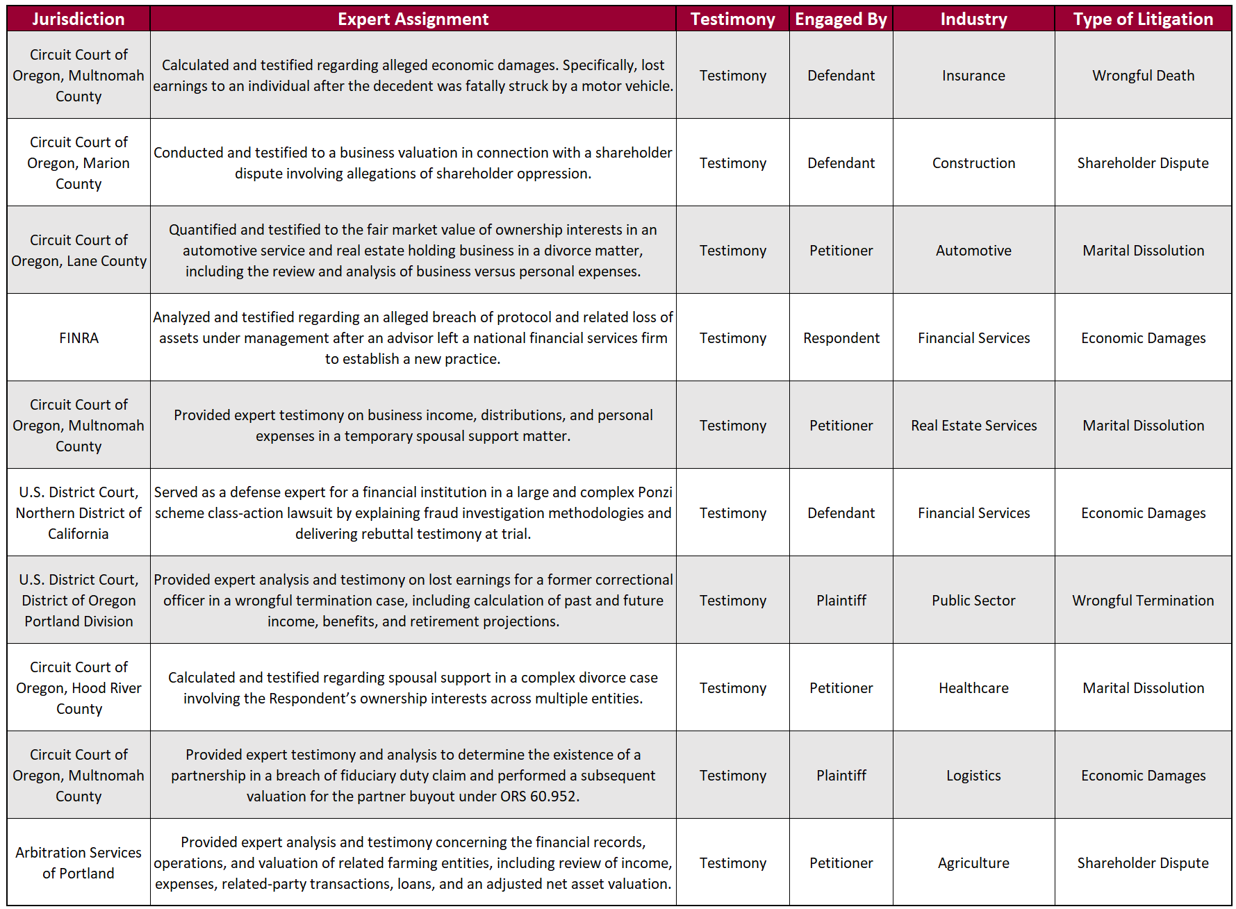 We provided the following types of Financial Forensic Services: Business Interruption Claims, Economic Damages, Forensic Accounting, Marital Dissolution, Shareholder Disputes, Trade Secrets & Intellectual Property, and Wrongful Termination, Personal Injury, and Wrongful Death